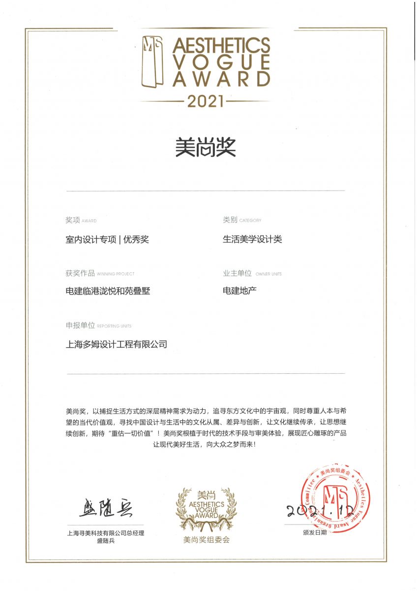 公司选送的《电建临港泷悦和苑叠墅》设计作品,在2021年度美尚奖室内设计专项-生活美学设计类中荣获优秀奖。