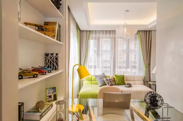 【2F】而“阳光”则是儿童房的主题,其卧室区与活动区域打通,书桌成了衔接两者的方式,三面落地大窗全方位满足了采光,加之明快的绿色与跃动的滑板元素,衬托动静相宜、阳光向上的翩翩少年。